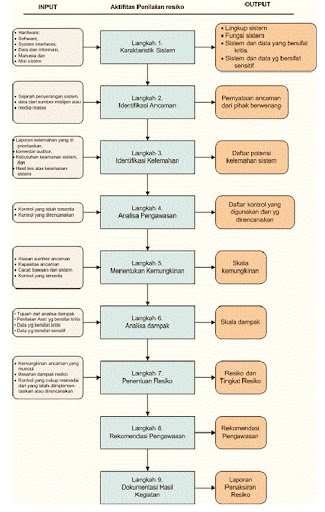 Untuk menentukan kemungkinan resiko yang timbul selama proses pengembangan sistem informasi berlangsung, maka organisasi yang bermaksud mengembangkan sistem informasi perlu menganalisa beberapa kemungkinan yang timbul dari pengembangan sistem informasi tersebut. Adapun metodologi penilaian resiko pengembangan sistem informasi dapat diuraikan dalam 9 langkah[4], yang tersusun sebagai berikut :